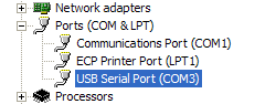 First you have to figure out for sure which COM port to use. In general, you should be able to pull up the Windows Device Manager for this. Right click on My Computer, select Properties, go to the Hardware tab and click on Device Manager. Now, expand the Ports (COM & LPT) tree node and you should see something like this image: