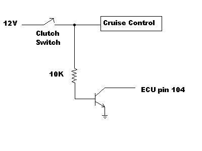 1. Splice a long wire from the cruise-control side of the switch (green with black stripe) and run it to the vicinity of the ECU connector. 2. Connect one end of a 10K-ohm resistor in series with the long wire (at the ECU end). 3. Connect the other end of the resistor to the base of an NPN transistor (a 2N2222A is fine). 4. Connect the emitter of the transistor to the grounded end of the cut wire on ECU pin 104. 5. Connect the collector of the transistor to the cut wire going to ECU pin 104.