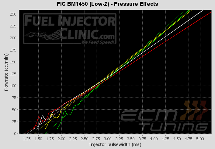 To illustrate this effect, we took a set of FIC BM1450s and ran them at varying fuel pressures from 35psi up to 60psi in 5psi increments. The results are shown below.